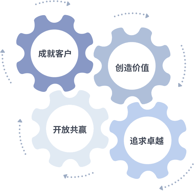 成就客户是一切决策的出发点,,,创造价值是衡量所有工作的标准,,,,追求卓越是我们做事做人的态度,,,开放共赢是我们的格局也是最终的结果。。。。价值观的齿轮环环相扣,,推动着组织里的每个人不断向前。。。。