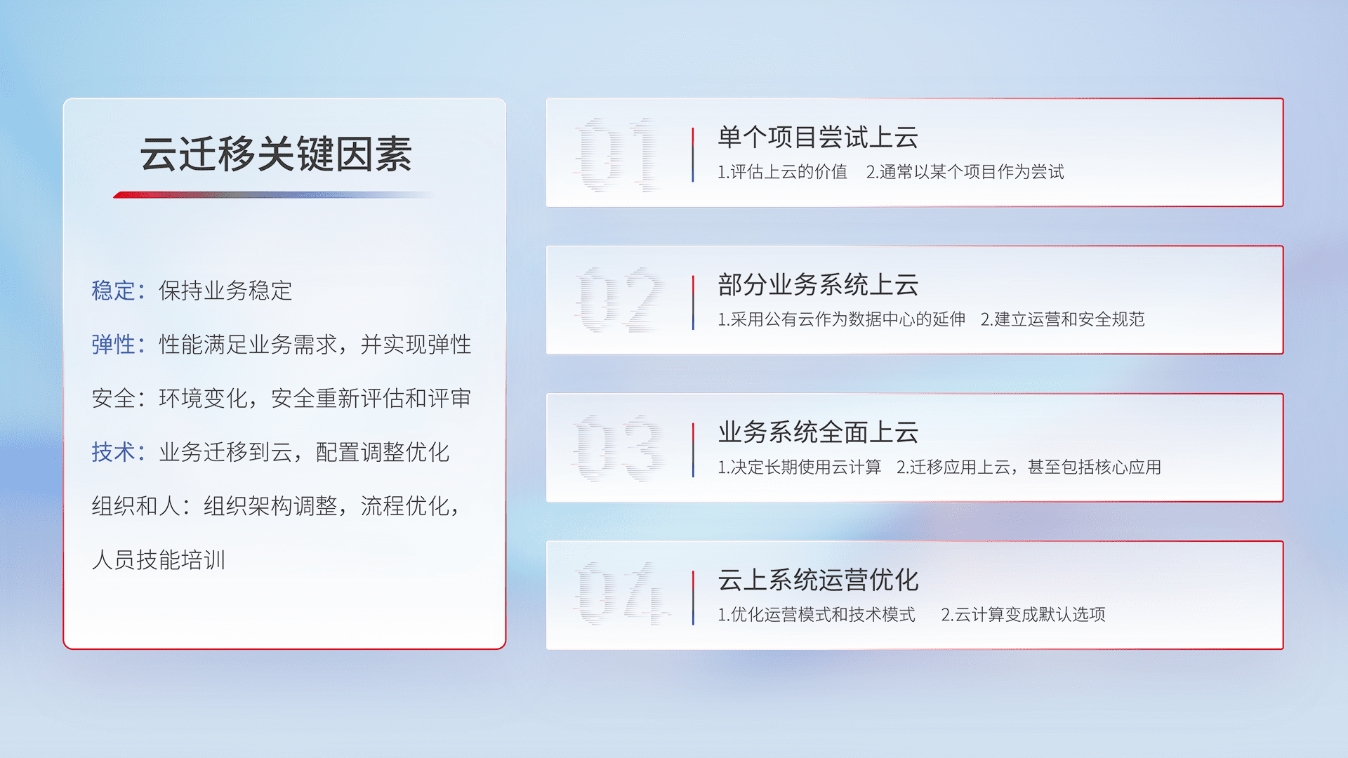 结合实际业务,,,,从规划设计、、、云平台选型、、、云原生改造、、、数据迁移、、、、集成交付,,迁移全过程为客户识别最佳上云路径,,,做好风险识别管理,,,,设计网络架构、、、身份权限、、安全审计合规、、、、操作审计、、日志审计、、监控告警策略、、、多站点容灾设计等,,,对云上基础设施进行整体规划,,,,提升IT治理水平,,,,以满足弹性、、高可用、、、、高性能的需求。。。。