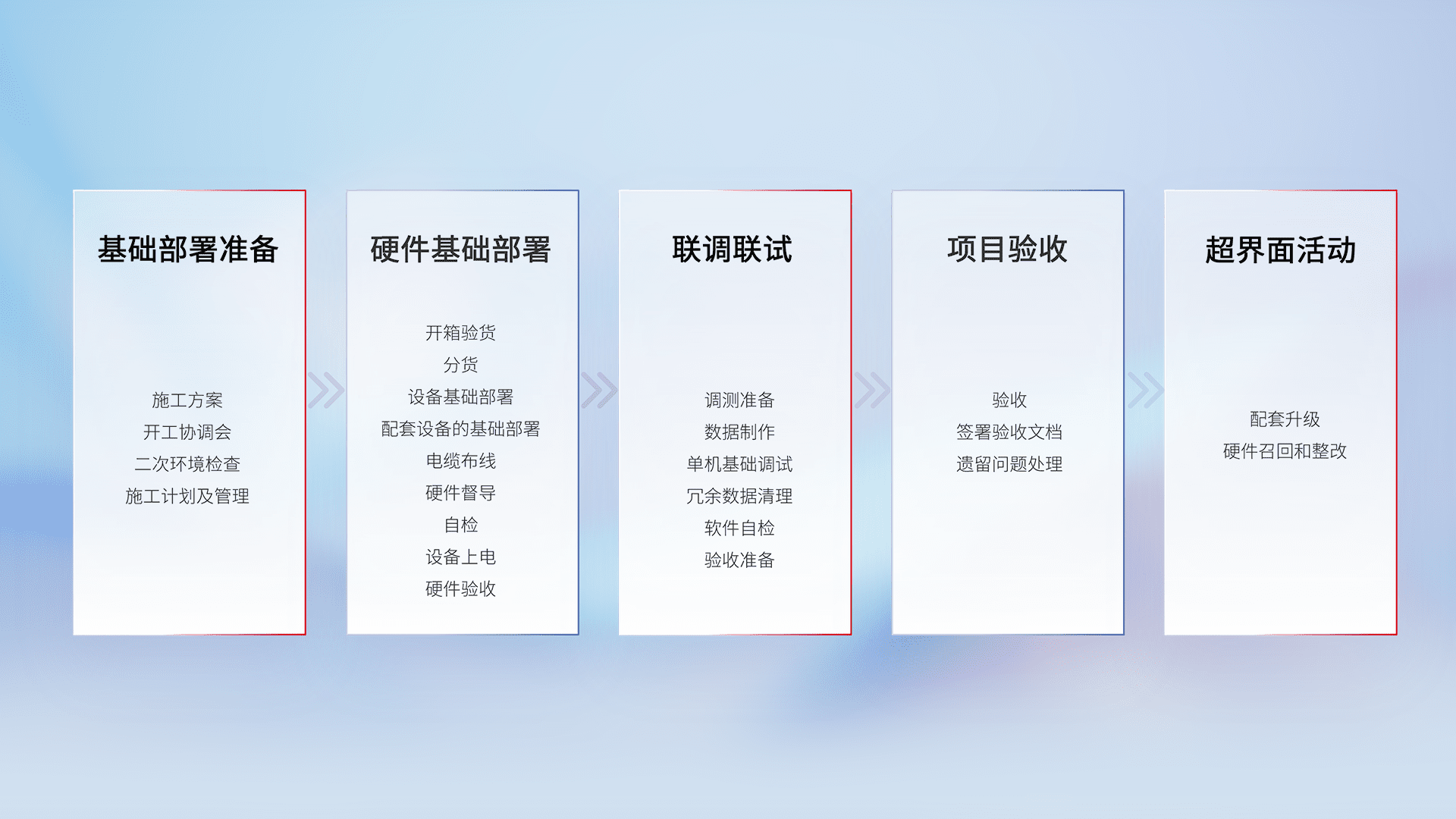 从基础部署准备、、硬件基础部署、、联调联试、、项目验收、、、、越界面活动的全过程可追溯,,,,保证施工质量和进度。。